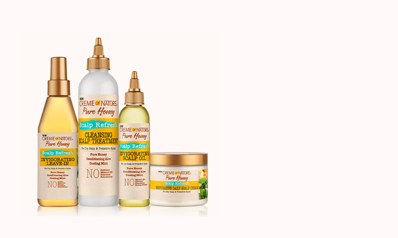 - SCALP REFRESHFormulated with our signature blend of Pure Honey, Natural Coconut Oil & Shea Butter and infused with Aloe & Mint, this collection refreshes and restores moisture balance to dry scalp and is perfect for protective styles.